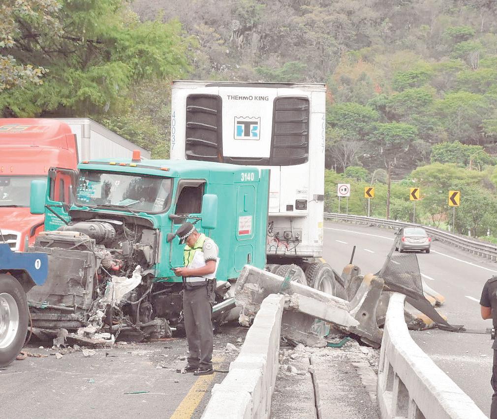 Tras ser impactado por una unidad pesada, tráiler terminó chocando contra muro de contención y base de puente, en Nogales.