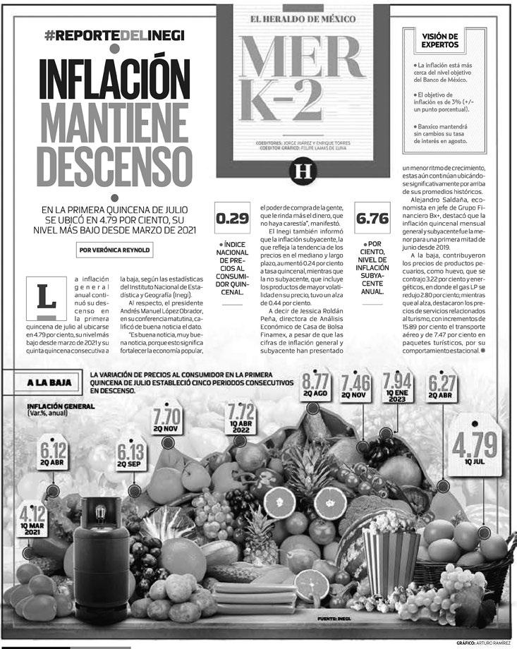 Y para más pruebas de que este proyecto de nación va viento en popa, un reporte del Instituto Nacional de Estadística y Geografía (INEGI) indica que la inflación en México se sigue desacelerando y en la primera quincena de julio descendió a 4.79 por ciento, tras ubicarse en junio en 5.06 por ciento. Así, reporta que el índice de precios subyacente aumentó 6.76% a tasa anual, mientras que el de precios no subyacente presentó una caída del 0.97% a tasa anual.