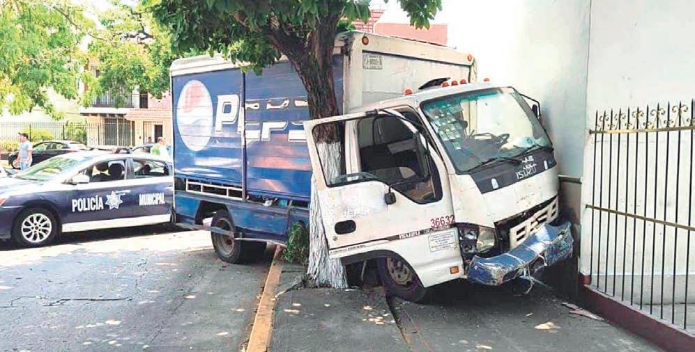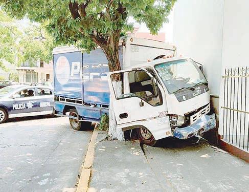El chofer de un camión repartidor de refrescos perdió el control de la unidad y chocó contra la barda de la Iglesia Santa Rosa y un árbol, luego que la unidad se quedara sin frenos.