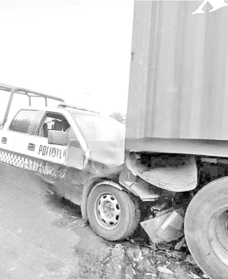 En el lugar, la patrulla terminó con el frente totalmente destrozado, provocando que los elementos que viajaban en la unidad resultaran lesionados.