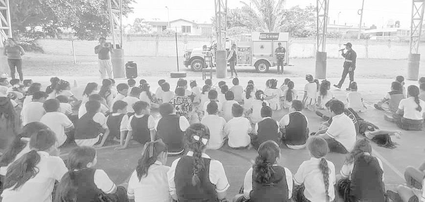 Durante la plática, se brindó a los niños una detallada explicación sobre las funciones y actividades de Protección Civil, así como una demostración práctica sobre el uso y funcionamiento de extintores. Además, se abordó el significado de la señalética, la importancia de la cinta de precaución, y se proporcio-