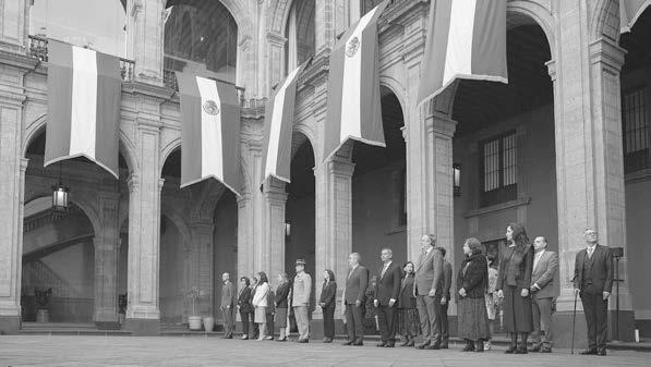 Como parte de la Ceremonia Oficial de Bienvenida en el Patio de Honor de Palacio Nacional se entonaron los himnos nacionales de México y Francia. Enseguida, la Presidenta de México y su homólogo de la República Francesa se tomaron la fotografía oficial.