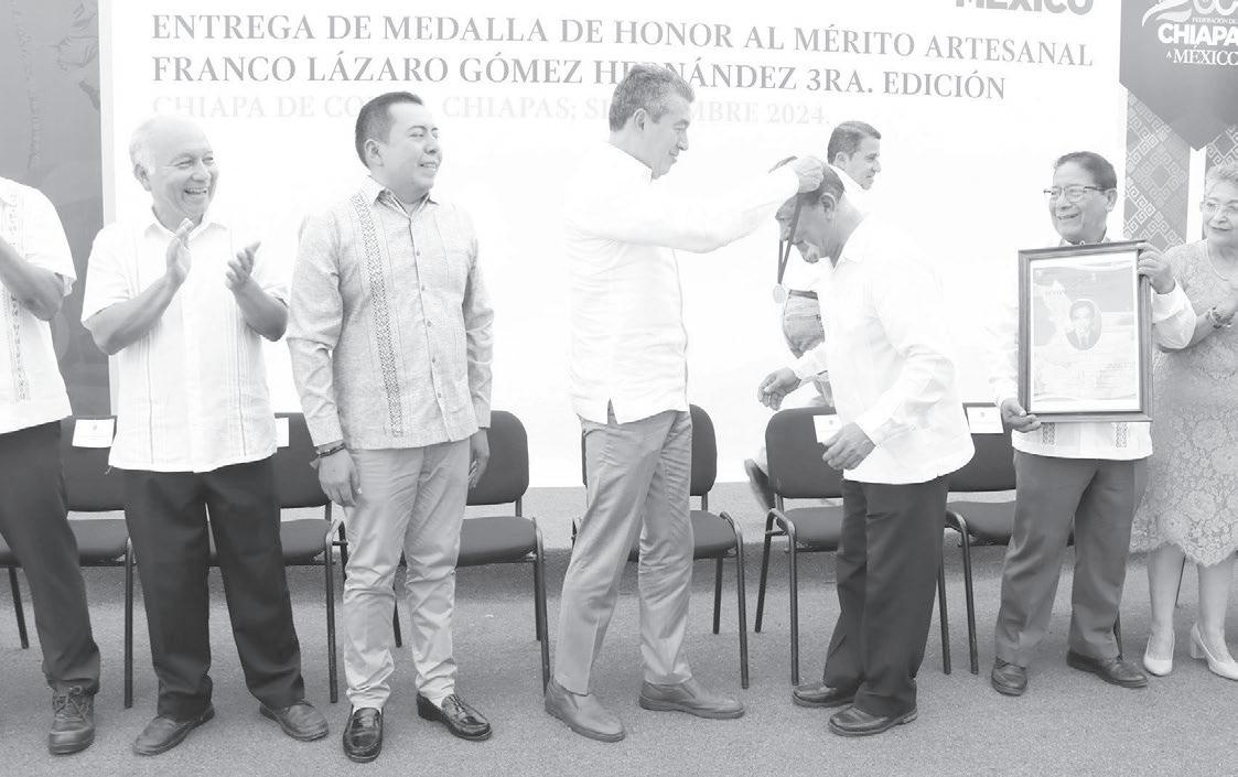 En Chiapa de Corzo, el gobernador hizo entrega de la Medalla al Mérito Artesanal Franco Lázaro Gómez Hernández a los hermanos Nandayapa Vargas, reconocidos por la construcción de marimbas. P. 5