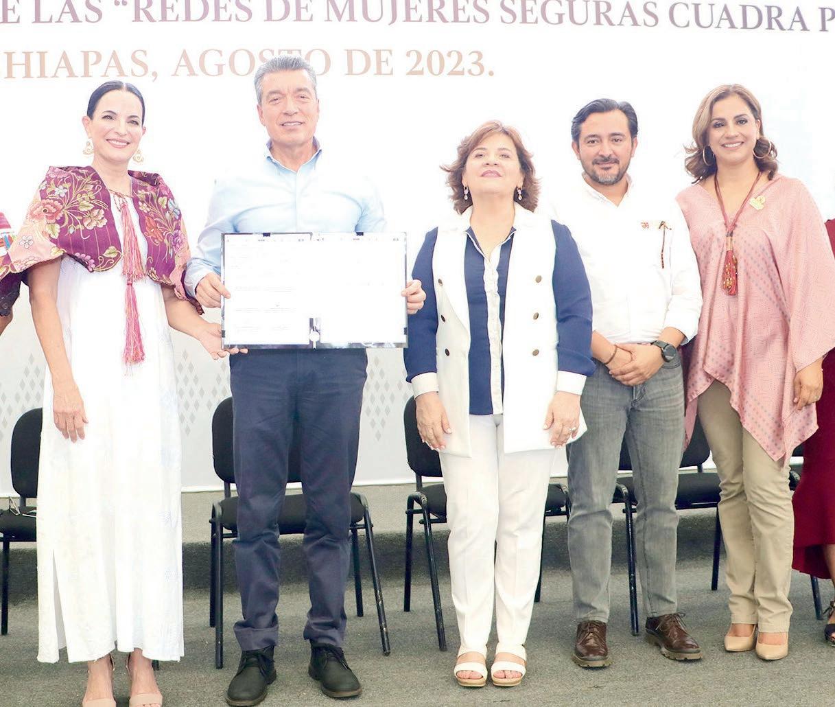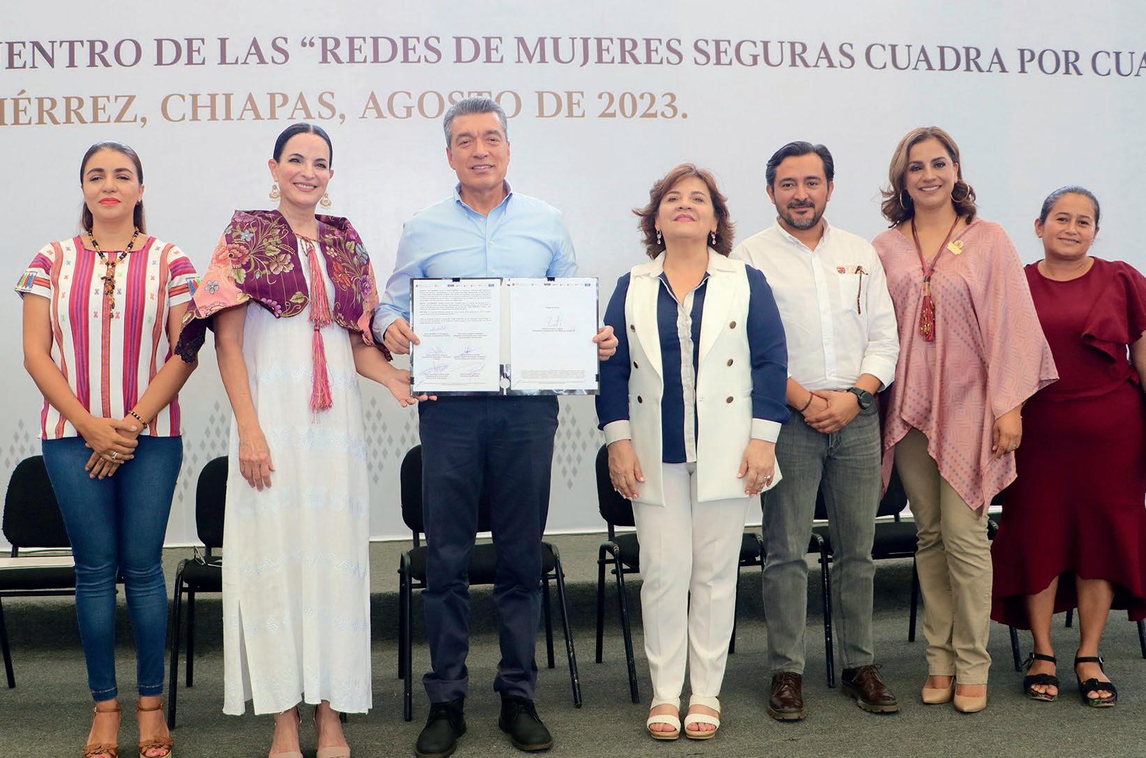 Al atestiguar la firma del acuerdo institucional para la Estrategia Estatal Redes de Mujeres Seguras Cuadra por Cuadra, en el marco de la Estrategia Nacional de Mujeres Constructoras de Paz, destacó que en Chiapas se hace causa común con la Federación para fortalecer las acciones a favor de la recuperación de espacios públicos, el establecimiento de entornos seguros, el combate de la violencia de género y la participación comunitaria femenina en los ámbitos económico, político y social.