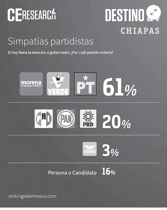 Destino 24, de C&E Research, es la encuesta de preferencia electoral y simpatías partidistas que cada mes mide el crecimiento de los perfiles que aspiran a las candidaturas de los diferentes partidos en Chiapas. De los resultados de agosto de este año se
