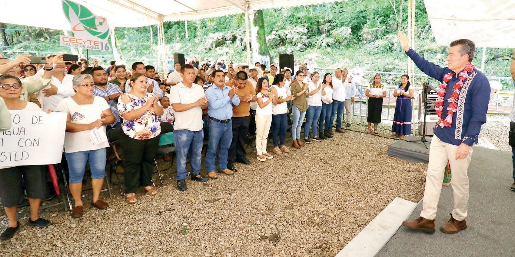 En su gira por Salto de Agua, el gobernador también inauguró la rehabilitación del sistema de agua potable que abastece a la cabecera municipal y las comunidades de Poza Azul y Lumijá, las cuales ahora cuentan con agua limpia, extraída del río, para atender estas necesidades sensibles de la gente.