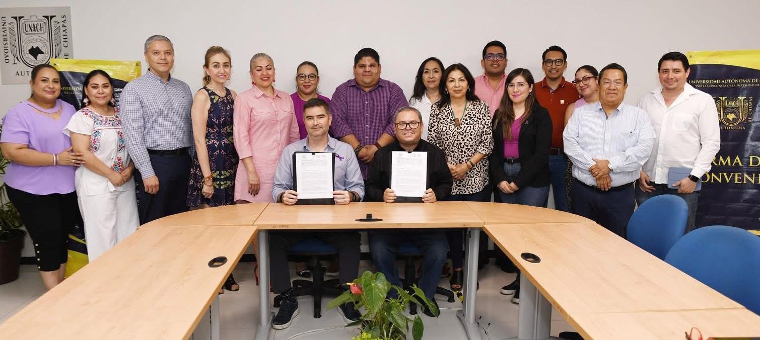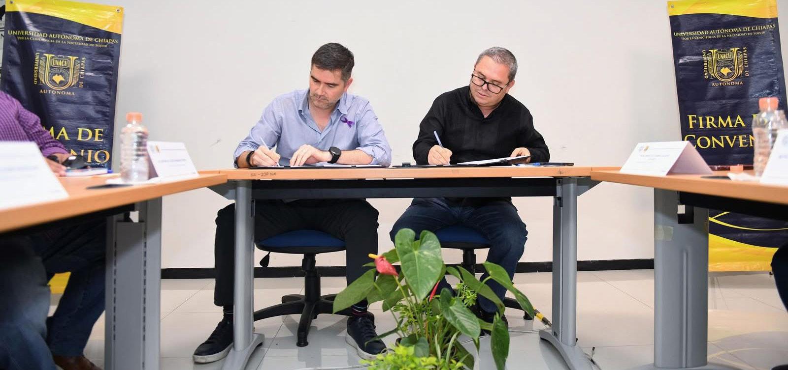 El rector de la Universidad Autónoma de Chiapas, Oswaldo Chacón Rojas y el secretario de Economía y el Trabajo, Luis Pedrero González, firmaron un convenio general de colaboración institucional, en las instalaciones de la máxima casa de estudios.