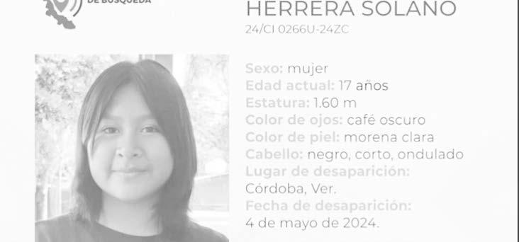La ficha 24/CI 0266U-24ZC reporta la desaparición de Gabriela Herrera Solano, de 17 años de edad, con quien se perdió contacto el pasado 4 de mayo de 2024 en Córdoba, Veracruz.