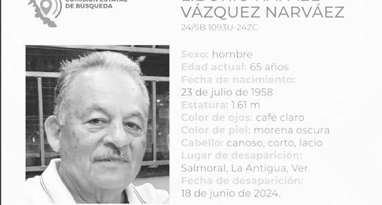 La ficha 24/SB 1093U-24Zc reporta la desaparición de Liborio Rafael Vázquez Narváez, de 65 años de edad, con quien se perdió el contacto el pasado 18 de junio de 2024 en Salmoral, La Antigua, Veracruz.