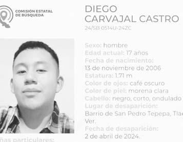 La ficha 24/SB 0514U-24ZC reporta la desaparición de Diego Carvajal Castro, de 17 años de edad, con quien se perdió el contacto el pasado 2 de abril de 2024 en el Barrio de San Pedro Tepepa, Tlaquilpa, Veracruz.