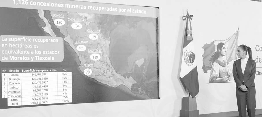 La Presidenta de México, Claudia Sheinbaum Pardo, destacó que la recuperación de mil 126 concesiones mineras —realizada en lo que va de su gobierno— y que abarcan 889 mil 512 hectáreas (ha) permite garantizar que en Áreas Naturales Protegidas (ANP) no haya explotación minera en favor del medio ambiente, ya que 713 de esas concesiones se encuentran en 249 mil 108 ha de ANP.
