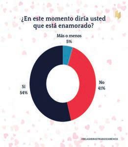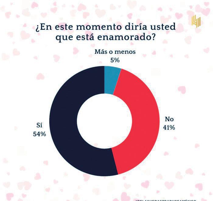 Los resultados de una encuesta de la firma De las Heras Demotecnia, levantada en el marco del Día del Amor y la Amistad, que se celebra este 14 de febrero, revelan que el 54 por ciento de los mexicanos dijo estar enamorado, mientras que el 21% confesó que no es correspondido y el 5 por ciento contestó “más o menos”.