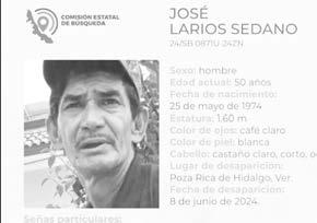La ficha 24/SB 0871U-24ZN reporta la desaparición de José Larios Sedano, de 50 años de edad, con quien se perdió contacto el pasado 8 de junio de 2024 en Poza Rica, Veracruz.