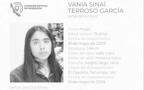 La ficha 24/SB 0870U-24ZC reporta la desaparición de Vania Sinaí Terroso García, de 15 años de edad, con quien se perdió contacto el pasado 12 de mayo de 2024 en El Coyolito, Tenampa, Veracruz.