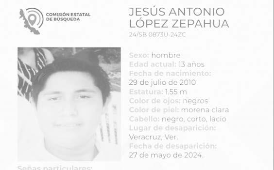 La ficha 24/SB 0873U-24ZC reporta la desaparición de Jesús Antonio López Zepahua, de 13 años de edad, con quien se perdió el contacto el pasado 27 de mayo de 2024 en Veracruz, Veracruz.