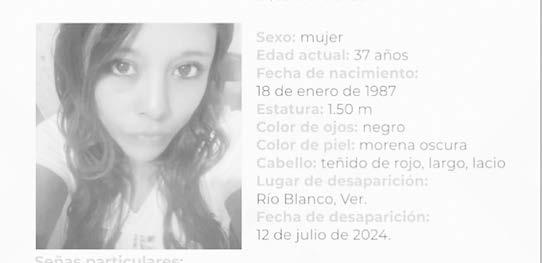Guadalupe Díaz Hoyos de 37 años y con domicilio en Río Blanco, desapareció el viernes 12 de julio, la cual cuenta con una cicatriz en la ceja y de complexión delgada como señas particulares, además tiene una estatura de 1.50 metros, ojos color negro, de tez morena oscura y con cabello teñido de rojo, largo y lacio.