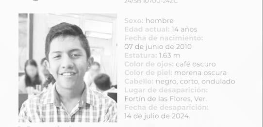 El adolescente Carlos Mora Santiago de 14 años y con domicilio en Fortín de Las Flores, desapareció ayer domingo 14 de julio y es de complexión delgada y nariz chata como señas particulares, además tiene una estatura de 1.63 metros, ojos café oscuros, de tez morena oscura y con cabello negro, corto y ondulado.