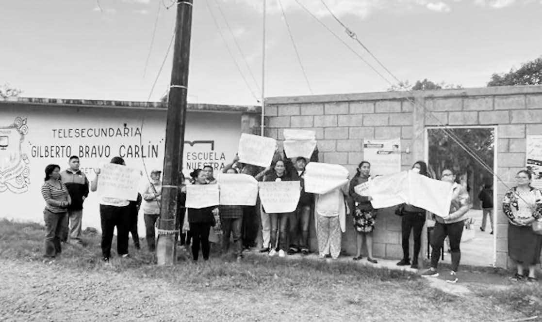 La mañana de este lunes, padres de familia de la Telesecundaria Gilberto Bravo Carlín se manifestaron para exigir la restitución del servicio de