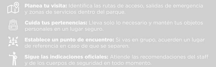 móvil, unidades de auxilio vial, agentes caninos y equinos, para reforzar las labores de seguridad. Las autoridades exhortan a los visitantes a seguir las recomendaciones oficiales, como planear su visita identificando rutas de acceso y salidas de emergencia, cuidar sus pertenencias, establecer un punto de encuentro con su grupo y atender las indicaciones del personal de vigilancia. En caso de emergencia, el número 911 está disponible para cualquier reporte.