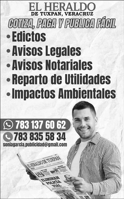 El Heraldo de Veracruz es una publicación de lunes a sábado. Editor responsable Ing. Eduardo Sánchez Macías, Número de Certificado de Reserva de Derecho al Uso Exclusivo del título 04-2010110913249400-101. Certificado de Licitud de Título: 15875. Certificado de licitud de contenido 15875. Domicilio de la publicación, impreso y distribuido por El Heraldo de Veracruz, con domicilio en Blvd. Rafael Martínez de la Torre #168 Col. San Manuel, Martínez de la Torre, Veracruz C.P. 93600, México. Tel. 01 (232) 3248546 y (232) 3244676.