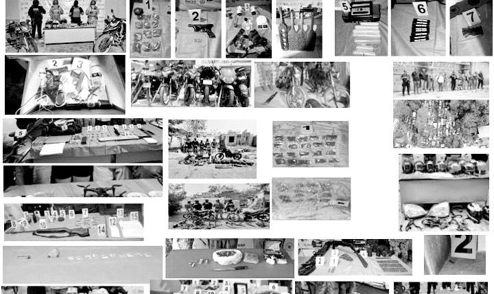 un arma blanca, una pipa de cristal, cartuchos balísticos, posible material bélico de instrucción de guerra, una báscula gramera, bolsas de plástico tipo ziploc, una camisola verde camuflaje, teléfonos celulares, diversas motocicletas, cascos, papel presumiblemente para uso de documentos oficiales con logos de diferentes instituciones, dispositivos de almacenamiento, un automóvil, cascos para motocicleta, placas NIV, documentos diversos, múltiples llaves y autopartes para moto.