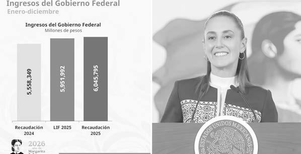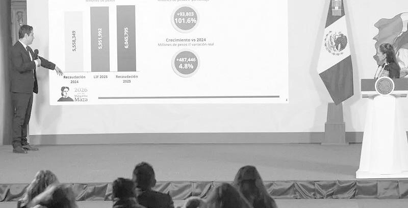 La Presidenta de México, Claudia Sheinbaum Pardo, destacó que, sin aumentar impuestos y por combatir la evasión fiscal, en 2025 se alcanzó récord de recaudación con 487 mil 446 millones de pesos (mdp) más, respecto a 2024, lo que significó un aumento histórico de 4.8 por ciento en términos reales. Además, recordó que en 2026 se proyecta recaudar 496 mil 309 mdp más que el año pasado.