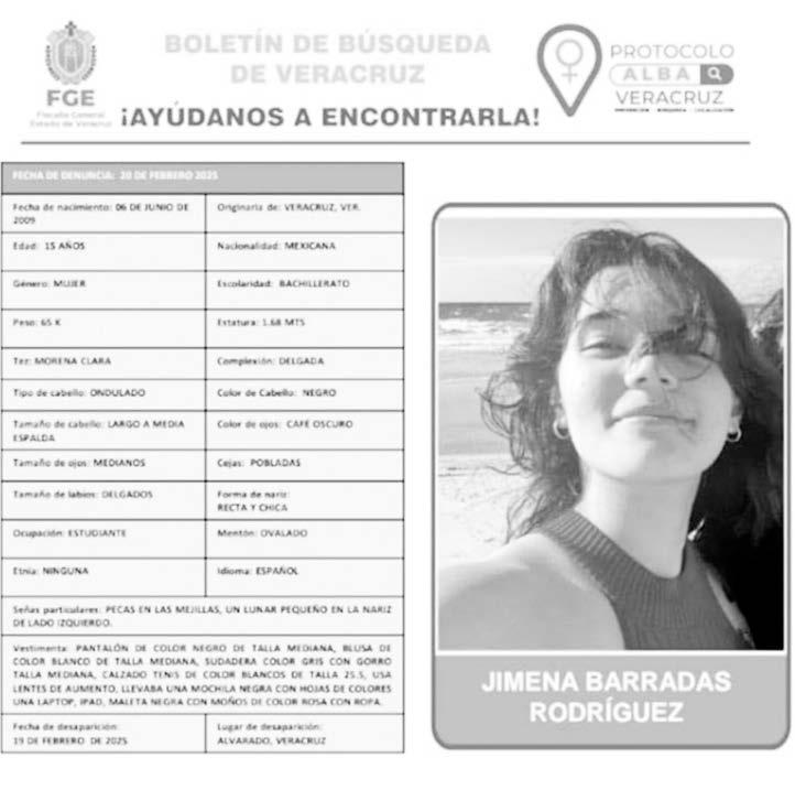 De acuerdo con el Protocolo Alba, se trata de Jimena Barradas Rodríguez, de 15 años de edad, cuya desaparición se registró el miércoles 19 de febrero en el municipio de Alvarado.