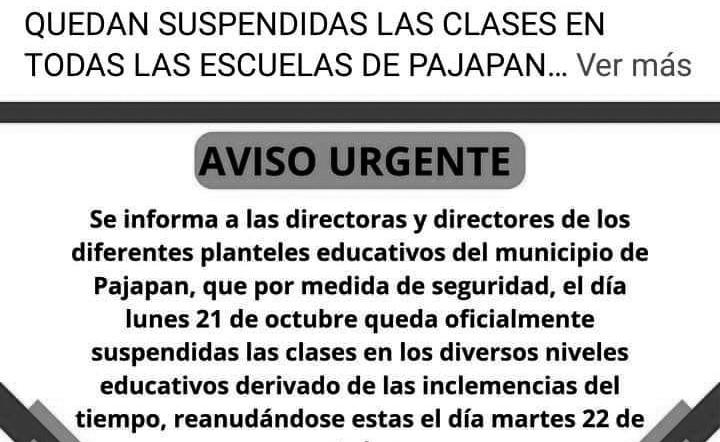 De igual forma, la dirección de la Escuela Secundaria General número 2 de Boca del Río recomendó a los padres de familia valorar el envío de sus hijos a clases debido a las lluvias registradas en la costa central del estado.