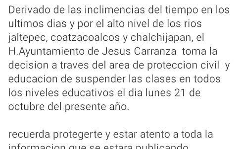 Son las ciudades de Soconusco, Oluta, Acayucan, San Juan Evangelista, Pajapan, quienes hicieron oficial la cancelación de actividades escolares.