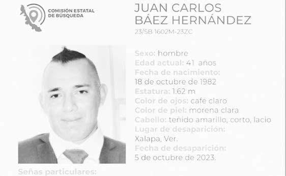 La ficha 23/SB 1602M-23ZC reporta la desaparición de Juan Carlos Báez Hernández, de 41 años de edad, con quien se perdió el contacto el pasado 5 de octubre de 2023 en Xalapa, Veracruz.