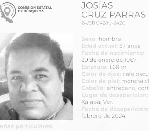 La ficha 24/SB 0428U-24ZC reporta la desaparición de Josías Cruz Parras, de 57 años de edad, con quien se perdió el contacto en el mes de febrero de 2024 en Xalapa, Veracruz.