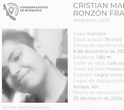 La ficha 24/SB 0423U-24ZC reporta la desaparición de Cristian Manuel Ronzón Franco, de 19 años de edad, con quien se perdió el contacto el pasado 20 de marzo de 2024 en Xalapa, Veracruz.
