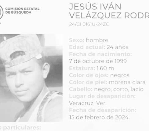La ficha 24/CI 0161U- 24ZC reporta la desaparición de Jesús Iván Velázquez Rodríguez, de 24 años de edad, con quien se perdió el contacto el pasado 15 de febrero de 2024 en Veracruz, Veracruz.
