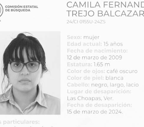 La ficha 24/CI 0155U-24ZS reporta la desaparición de Camila Fernanda Trejo Balcazar, de 15 años de edad, con quien se perdió el contacto el pasado 15 de marzo de 2024 en Las Choapas, Veracruz.