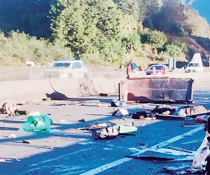 La unidad derrapó varios metros hasta impactarse, lo que ocasionó que la caja seca se desprendiera y por la fuerza con la que avanzaba cayera del puente.