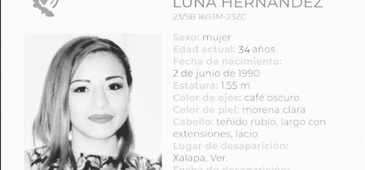 La ficha 23/SB 1603M-23ZC reporta la desaparición de Verónica Luna Hernández, de 34 años de edad, con quien se perdió el contacto el pasado 5 de octubre de 2023 en Xalapa, Veracruz.