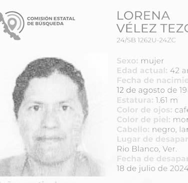 La ficha 24/SB 1262U-24ZC reporta la desaparición de Lorena Velez Texcahua, de 42 años de edad, con quien se perdió el contacto el pasado 18 de julio de 2024 en Río Blanco, Veracruz.