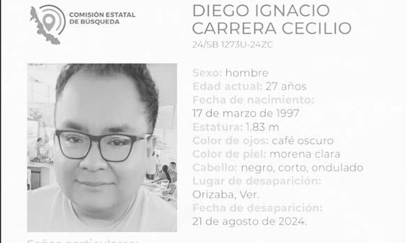 La ficha 24/SB 1273U-24ZC reporta la desaparición de Diego Ignacio Carrera Cecilio, de 27 años de edad, con quien se perdió el contacto el pasado 21 de agosto de 2024 en Orizaba, Veracruz.