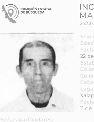La ficha 24/CI 0169U-24ZC reporta la desaparición de Inocencio Martínez, de 78 años de edad, con quien se perdió el contacto el pasado 11 de marzo de 2024 en Xalapa, Veracruz.