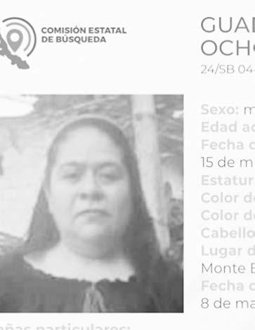 La ficha 24/SB 0441U-24ZC reporta la desaparición de Guadalupe Ochoa López, de 48 años de edad, con quien se perdió el contacto el pasado 8 de marzo de 2024 en Monte Blanco, Teocelo, Veracruz.
