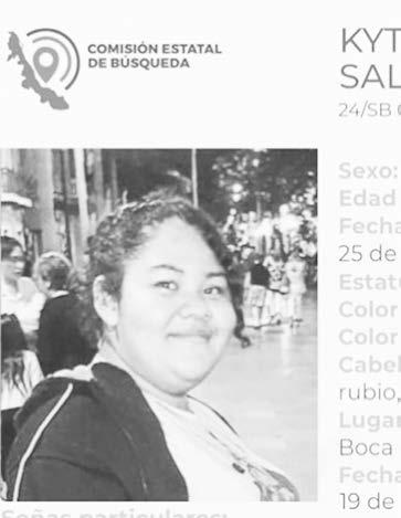 La ficha 24/SB 0421U-24ZC reporta la desaparición de Kytzhia Elizabeth Salas Gregorio, de 12años de edad, con quien se perdió el contacto el pasado 19 de marzo de 2024 en Boca del Río, Veracruz.