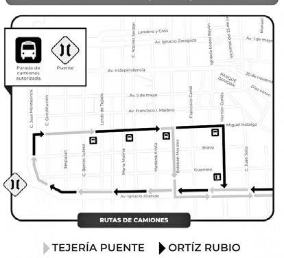 ⁃ La ruta alterna de los camiones *TejeríaPuente y Ortiz Rubio* será hasta Montesinos para retornar sobre la avenida Miguel Hidalgo.