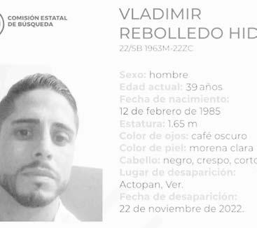 La ficha 22/SB 1963M-22ZC reporta la desaparición de Vladimir Rebolledo Hidalgo, de 39 años de edad, con quien se perdió el contacto el pasado 22 de noviembre de 2022 en Actopan, Veracruz.