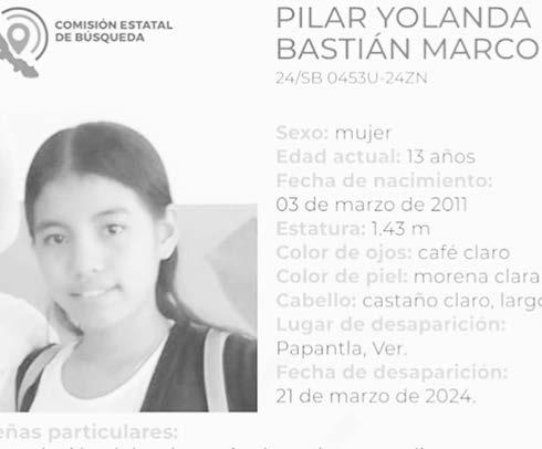 la desaparición de Pilar Yolanda Bastián Marcos, de 13 años de edad, con quien se perdió contacto el pasado21 de marzo de 2024 en Papantla, Veracruz. La ficha 24/SB 0455U-24ZN reporta la desaparición de Benjamín Acuña Nepomuceno, de 14 años de edad, con quien se perdió contacto el pasado 24 de marzo de 2024 en Tihuatlán, Veracruz.