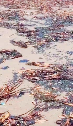 El chapopote llegó a la costa acompañada del lirio acuático en la orilla de la costa.