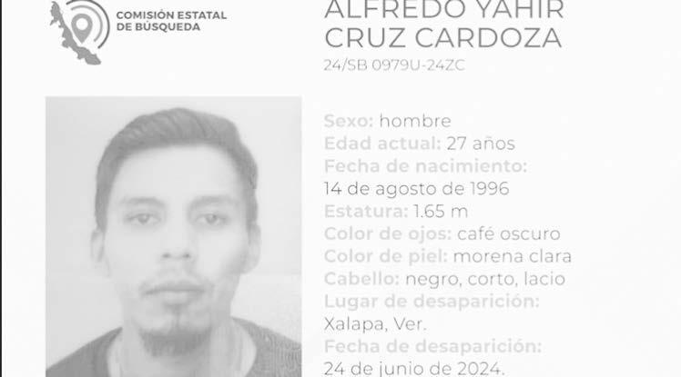La ficha 24/SB 0979U-24ZC reporta la desaparición de Alfredo Yahir Cruz Cardoza, de 27 años de edad, con quien se perdió el contacto el pasado 24 de junio de 2024 en Xalapa.