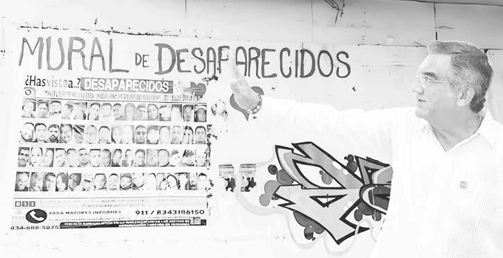 mural con fotografías y datos de desaparecidos en Tamaulipas