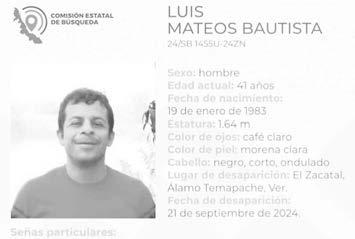 La ficha 24/SB 1455U-24ZN reporta la desaparición de Luis Mateos Bautista, de 41 años de edad, con quien se perdió el contacto el pasado 21 de septiembre de 2024 en Álamo-Temapache, Veracruz.
