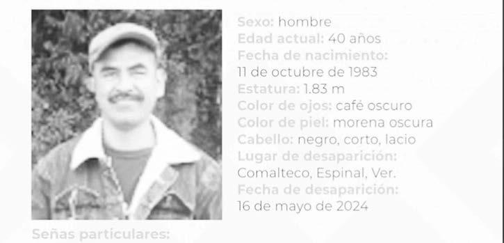 La ficha 24/CI 0299U-24ZN reporta la desaparición de Carlos Gabriel Cabrera Vázquez, de 40 años de edad, con quien se perdió el contacto el pasado 16 de mayo de 2024 en Comalteco, Espinal, Veracruz.