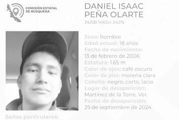 La ficha 24/SB 1465U-24ZN reporta la desaparición de Daniel Isaac Peña Olarte, de 18 años de edad, con quien se perdió el contacto el pasado 25 de septiembre de 2024 en Martínez de la Torre, Veracruz.